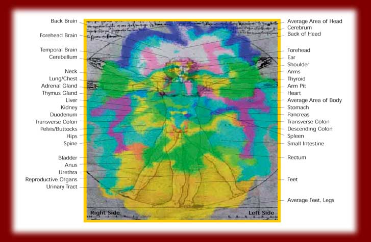 The data received from each organ are shown on the screen and allows you to see color quality and thoughtful description of each reflexive zone measured by Biopulsar. The color gives you greater and deeper understanding of the energy condition of each specific body part. Below there is an aura photograph which shows the correlation of human body parts. It gives scientific and objective interpretations for 50 organs, the full body electromagnetic field and seven major energy centers. Accessing the "real-time" energetic information in a few different formats allows the practitioner to instantly analyze the patient on a holistic level-not just physically but mentally, emotionally and spiritually as well.